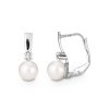 Elegantní, jednoduché, designově čisté náušnice s kvalitní kulatou sladkovodní bílou perlou a laboratorními diamanty, na klasické patentové zapínání (klapka). Díky důmyslnému řešení zakryjí i případné nedostatky vpichu. Perly jsou (jako u všech našich perlových šperků) zčásti navrtány, usazeny na šroubovitém dříku a zafixovány speciálním lepidlem, aby dobře držely, diamanty jsou zafasovány pomocí 4 pevných úchytů-krapen. Náušnice jsou krásnou klasikou, která nestárne, na naší prodejně velmi úspěšné.