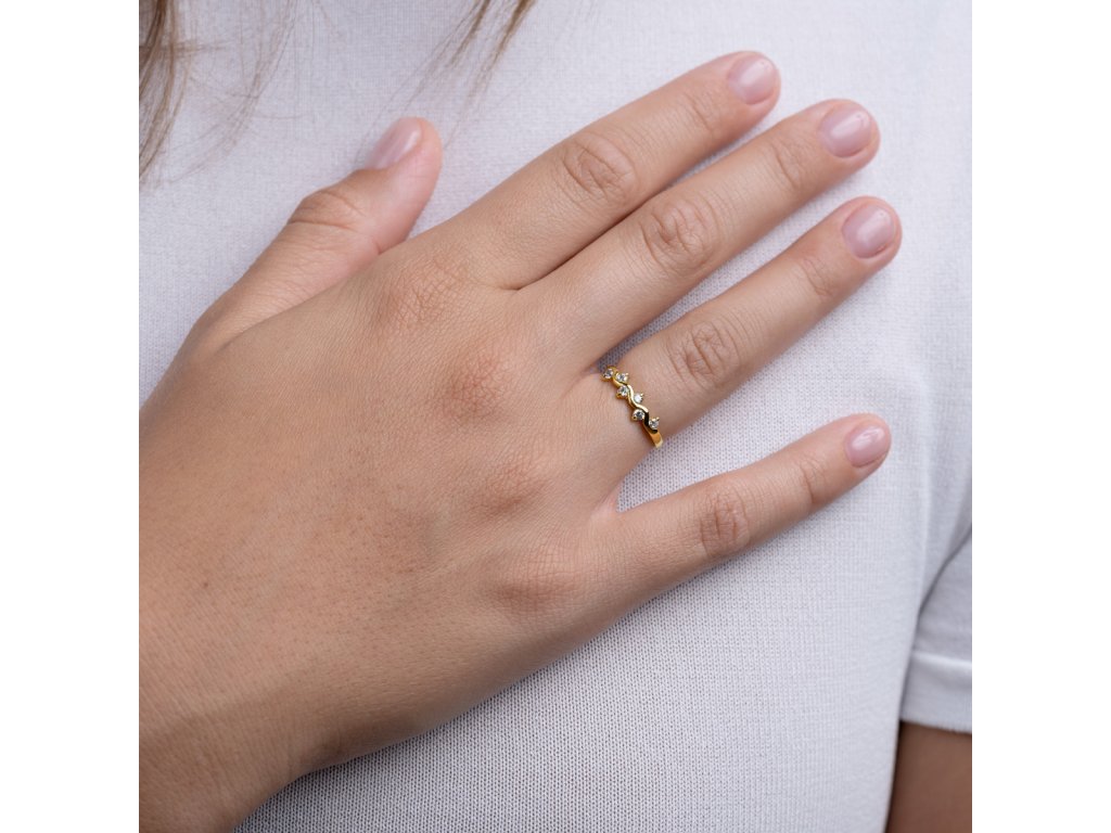 Krásný, jemný, roztomilý prstýnek s přírodním motivem vlnky, působí velmi harmonicky a něžně. Kamínky vypadají jako kapky rosy přichycené na drobné větvičce. Jsou uchyceny krapničkami, které jim dávají maximálně vyniknout. Prstýnek je vhodný pro drobnější ruku. Vyrábíme do soupravy také náušnice a přívěšek.