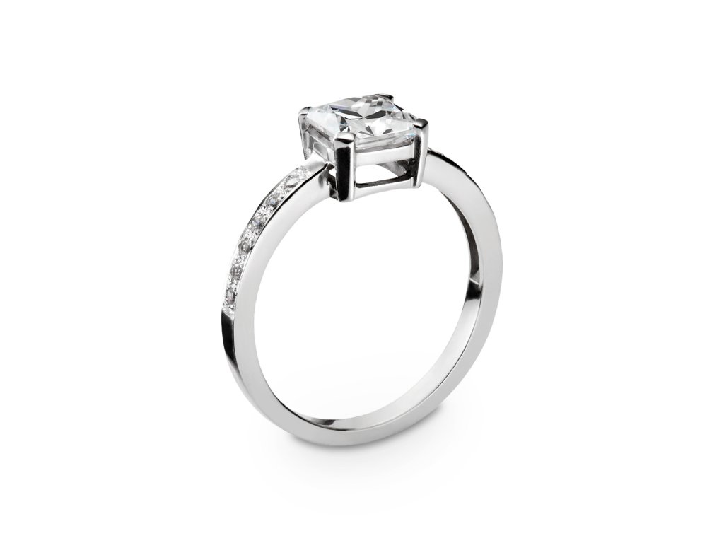 Velmi pěkný a efektní zásnubní prsten, který vyniká především svým velkým zářivým zirkonem ve tvaru čtverce. Prsten je včetně zafasování kamenů perfektně zpracován a ke středovému kameni proniká dostatek světla, aby se jeho efekt co nejvíce umocnil. Drobnými zirkonky, které prstýnek příjemně zjemňují, je vytvořen zajímavý kontrast.