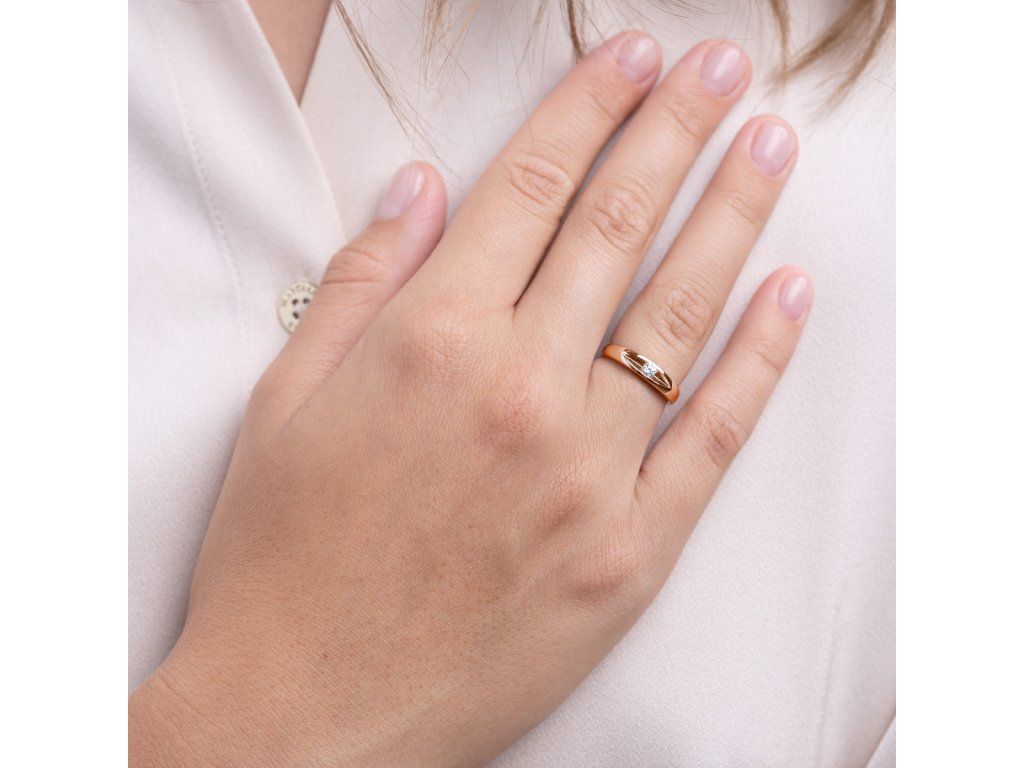 Obzvláště pěkně, vyváženě a tvarově čistě působí tento prstýnek z růžového zlata s velmi zajímavým usazením kamene, v tomto případě přírodního diamantu. Díky přístupu světla se kámen nádherně třpytí a přitom prsten splňuje i hledisko „praktického nošení“. Vypadá dobře v menší i větší velikosti - pro velmi drobnou ruku je vhodný podobný, ale drobnější model 256.90.